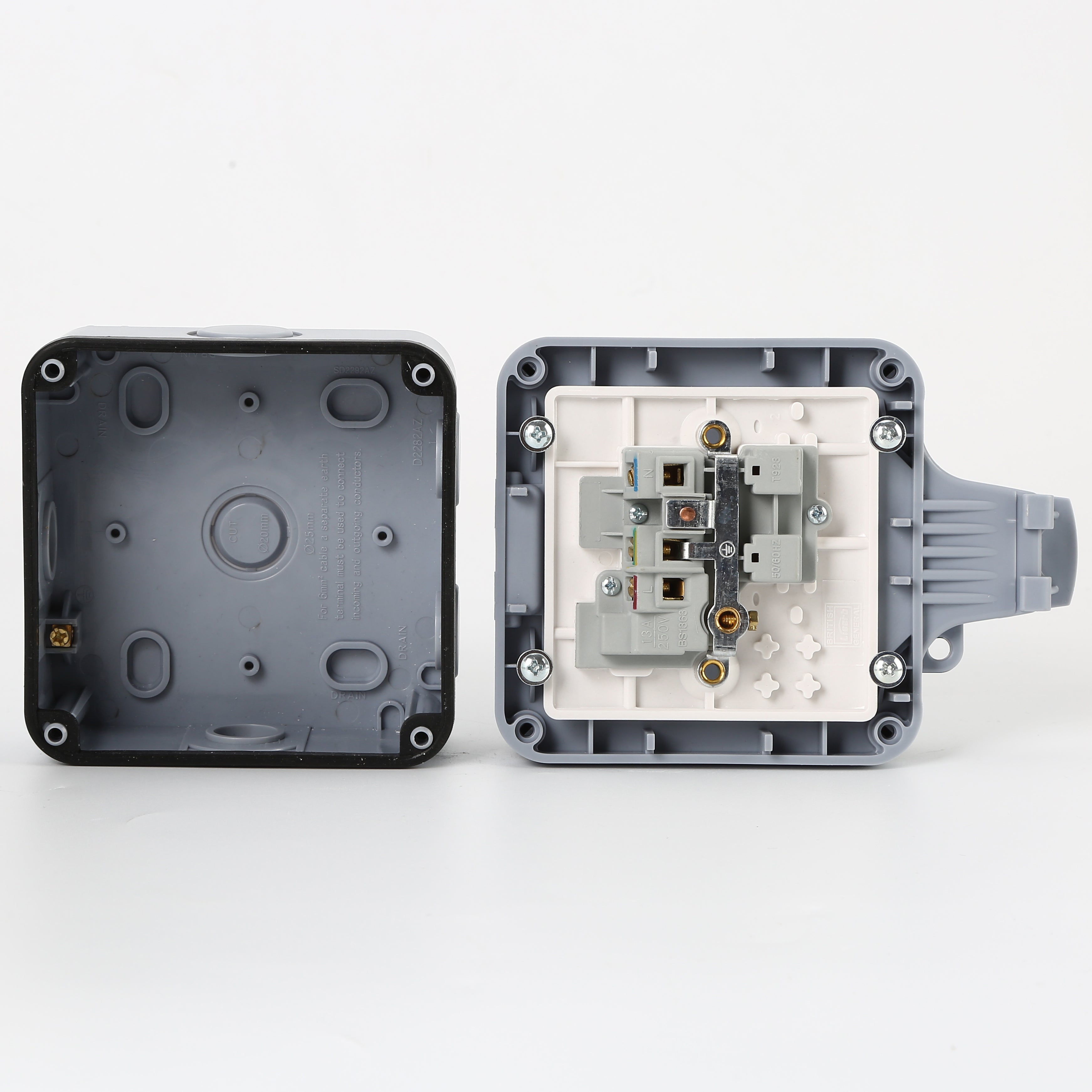 This Outdoor Socket is easy to install. It has clearly marked terminals with backed out captive screws. There is a choice of cable entries on four sides of the housing to cover all cable entry requirements. There are 2 rubber wall fixing seal covers to ensure protecction against water ingress. (Wall fixings are not supplied)
