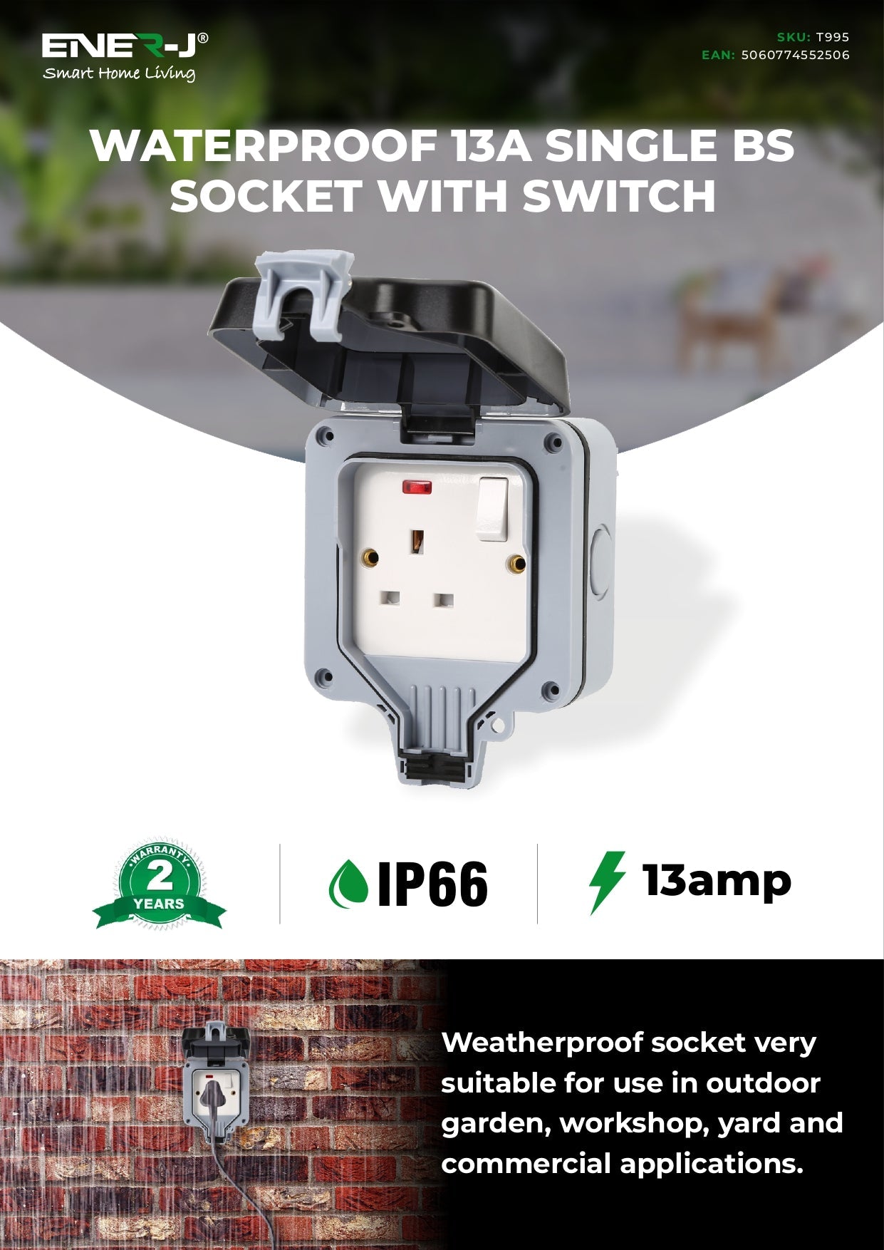 Weatherproof socket very suitable for use in outdoor garden,workshop,yard and commercial applications.